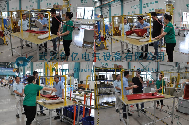客戶抵達公司后,負責接待的同事了解客戶的考察需求隨后一同前往我司生產車間。在公司技術人員的介紹下重點研究學習了CYJS-6系列 絕緣手套(靴)耐壓試驗裝置的操作流程、接線方法以及注意事項等理論知識,并用這套耐壓試驗裝置配合CYD系列絕緣墊(毯)試驗電極裝置一起做了實踐演示,讓客戶更清楚掌握試驗設備的使用方法、工藝流程等相關知識。
