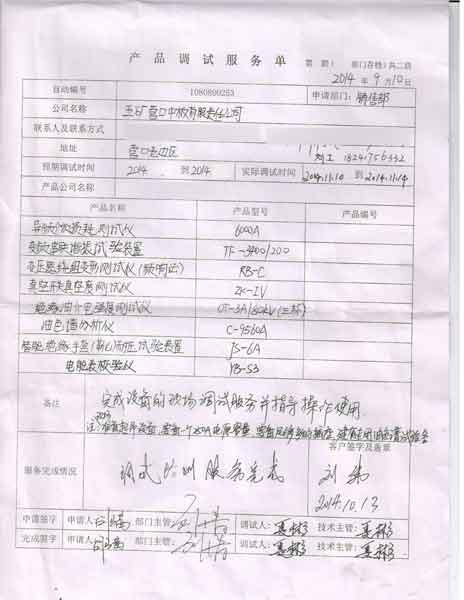2014-11-10  五礦營口中板有限責任公司(遼寧)進行調試服務,調試產品:CYTF-3400/200變頻串聯諧振試驗成套裝置