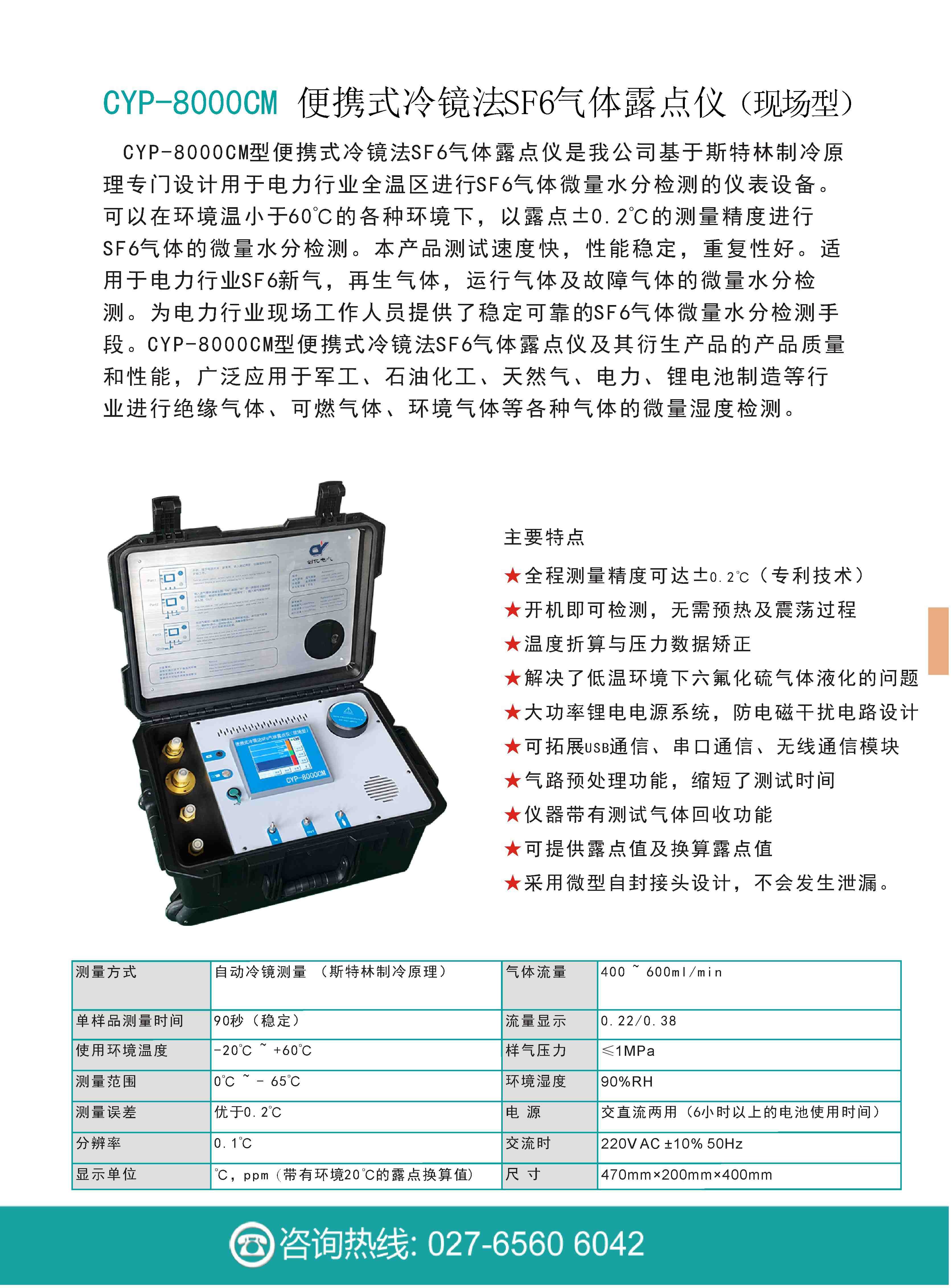 便攜式冷鏡法SF6氣體露點(diǎn)儀是我公司基于斯特林制冷原理專門設(shè)計(jì)用于電力行業(yè)全溫區(qū)進(jìn)行SF6氣體微量水分檢測的儀表設(shè)備。可以在環(huán)境溫小于60℃的各種環(huán)境下,以露點(diǎn)±0.2℃的測量精度進(jìn)行SF6氣體的微量水分檢測。本產(chǎn)品測試速度快,性能穩(wěn)定,重復(fù)性好。適用于電力行業(yè)SF6新氣,再生氣體,運(yùn)行氣體及故障氣體的微量水分檢測。為電力行業(yè)現(xiàn)場工作人員提供了穩(wěn)定可靠的SF6氣體微量水分檢測手段。便攜式冷鏡法SF6氣體露點(diǎn)儀及其衍生產(chǎn)品以其優(yōu)異的產(chǎn)品質(zhì)量和性能,廣泛應(yīng)用于軍工、石油化工、天然氣、電力、鋰電池制造等行業(yè)進(jìn)行絕緣氣體、可燃?xì)怏w、環(huán)境氣體等各種氣體的微量濕度檢測。