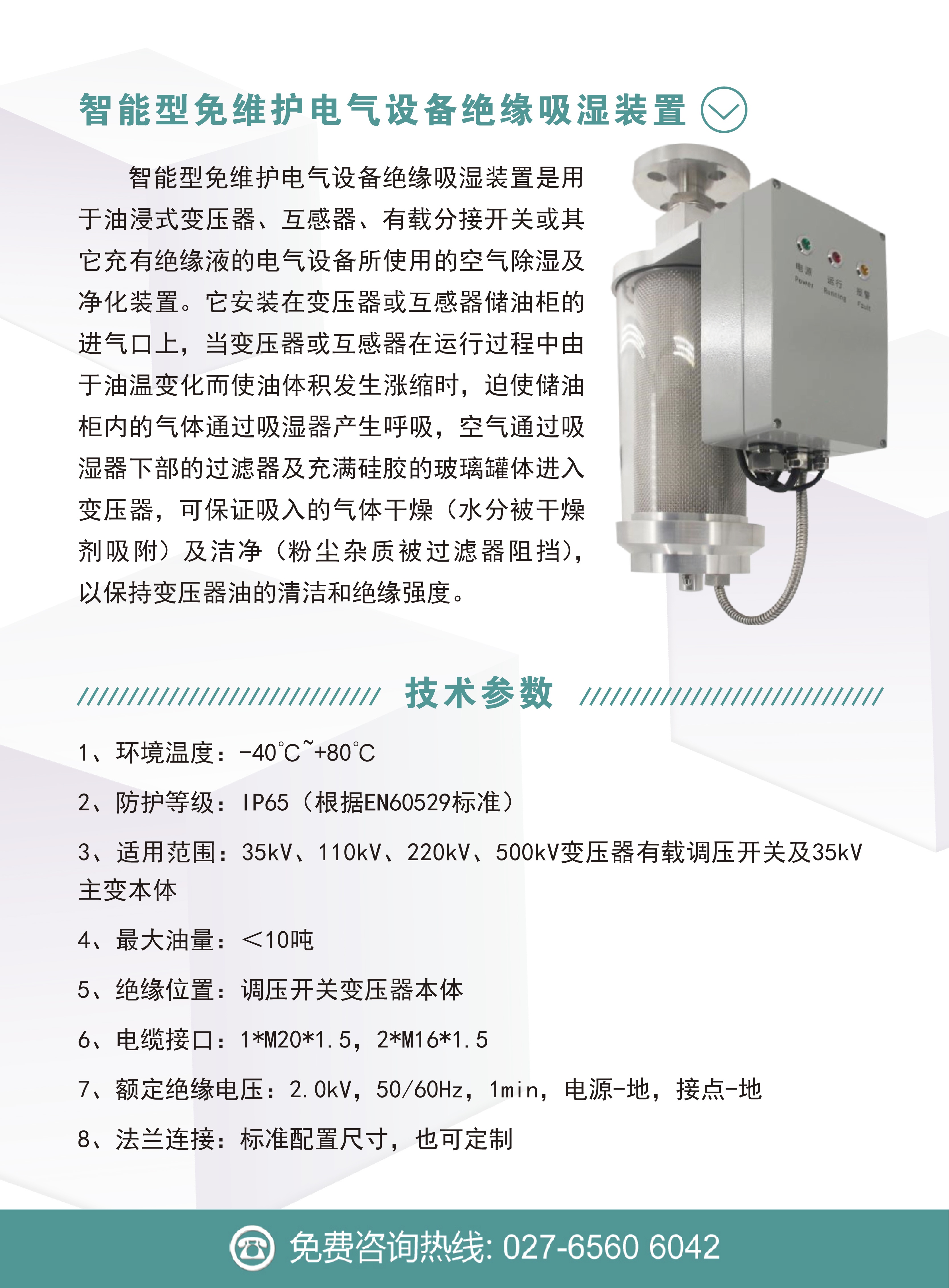 智能型免維護電氣設備絕緣吸濕裝置是用于油浸式變壓器、互感器、有載分接開關或其它充有絕緣液的電氣設備所使用的空氣除濕及凈化裝置。它安裝在變壓器或互感器儲油柜的進氣口上,當變壓器或互感器在運行過程中由于油溫變化而使油體積發生漲縮時,迫使儲油柜內的氣體通過吸濕器產生呼吸,空氣通過吸濕器下部的過濾器及充滿硅膠的玻璃罐體進入變壓器,可保證吸入的氣體干燥(水分被干燥劑吸附)及潔凈(粉塵雜質被過濾器阻擋),以保持變壓器油的清潔和絕緣強度。